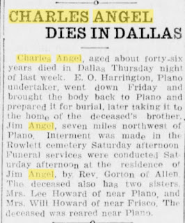 (3) "Texas Deaths, 1890-1976," database with images, FamilySearch (https://familysearch.org/ark:/61903/1:1:K3CB-NPV : 13 March 2018), Chas Thomas Angle, 17 Aug 1923; citing certificate number 23539, State Registrar Office, Austin; FHL microfilm 2,074,872.